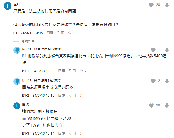- 私下交易:如Dcard上原PO分享在家樂福購買禮物卡的案例